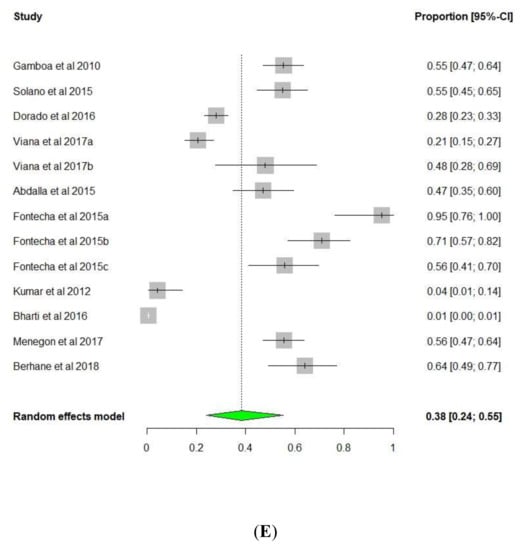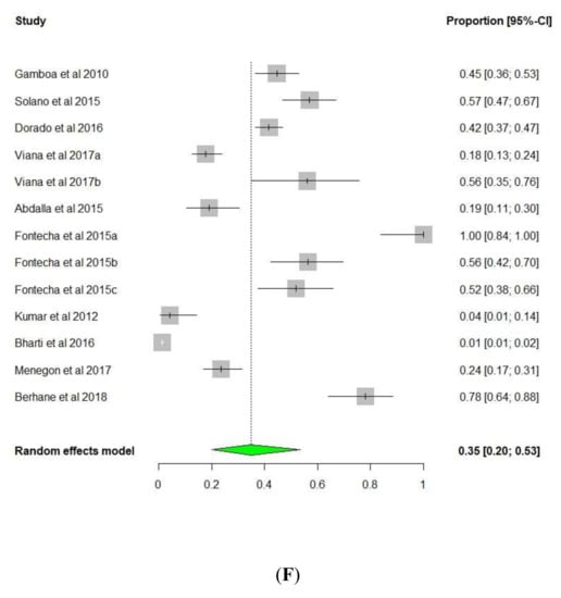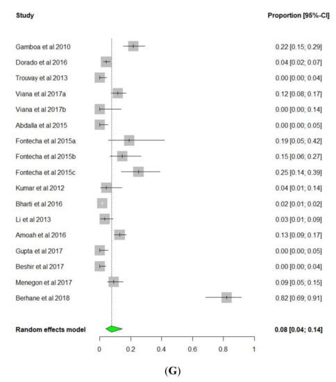 Forest plot showing the prevalence of (A): (pfhrp2 exon1-2) (B): (Upstream MALP1.230) (C): (Downstream MALP1.228) (D): (pfhrp3 exon1-2), (E): (Upstream MAL13P1.475) (F): (Downstream MAL13P1.485), and (G): (Double negative for pfhrp2 and pfhrp3).