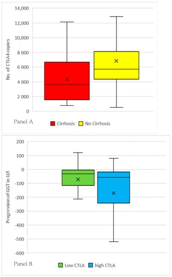 Panel A: Patients with primary biliary cholangitis (PBC) or primary sclerosing cholangitis (PSC) were subgrouped by presence of cirrhosis. The number of CTLA-4 copies was measured using mRNA Real-Time PCR and normalized by β-Actin as internal control. The X marks the mean value, the line inside the boxplot the median. Patients with cirrhosis have a mean number of 4359 copies, patients without cirrhosis have a mean number of 6836 copies (p = 0.04). Panel B: Patients with PBC were sorted by the determined number of CTLA-4 copies. Three equally large groups with either low, medium or high expression were formed. Patients with high and low expression were compared in the course of their disease by subtracting the lab values at initial diagnosis with the most current values for each patient. Patients with high CTLA-4 tend to have a recovery of elevated GGT-values more often [low: −69.8 U/l vs. high: −176.1 U/l p = 0.04]. The X marks the mean value, the line inside the boxplot the median. Patients with PSC showed the same trend without reaching statistical significance (low: −45.3 U/l vs. high: −105.4 U/l p = 0.08).
