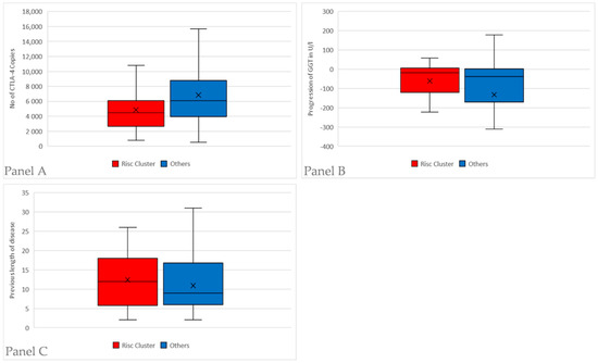 We compared the patients having CTLA4 SNP rs733618 and FOXP3 SNP rs2280883 in their homozygotic major variants (TT) (n = 44) with the other patients (n = 81). The homozygotic patients had lower number of CTLA−4 copies (4870 vs. 6848, p = 0.003). Progression of GGT, defined as difference between initial diagnosis and current value, showed weaker recovery than in the other patients (−61.7 U/l vs. −132.6 U/l, p = 0.04). There is no significant difference in mean AP levels of these patients (158.1 U/l vs. 189.7 U/l, p = 0.13) PSC is more often the relevant diagnosis in this group than in the other allele variants (n = 18/44; 40% vs. n = 17/81, 21%, p = 0.03). Also, cirrhosis tends to occur more often (n = 10/41, 24% vs. n = 11/81, 13%), but this difference is not statistically significant (p = 0.17). There is no significant difference in previous disease duration (12.4 years vs. 10.9 years, p = 0.3). The characteristics of this “risk cluster” having both CTLA4 SNP rs733618 and FOXP3 SNP rs2280883 in their homozygotic major variants are depicted in Figure 2 and Figure 3.