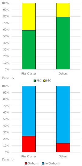 Characteristics of the subgroups formed by their allele variants in the two SNPs CTLA4 rs733618 and FOXP3 SNP rs2280883. If they were both homozygotic with the major variant (TT), defined as the predominant allele in the HapMap-population, they were included in the “risk cluster” (n = 44). Afterwards, they were compared with the remaining patients with a different allele variant in the two SNPs (n = 81). Panel A: Distribution of the disease entities in the risk cluster and the other patients. PSC appears more often in the “risk cluster” (n = 18/44; 40% vs. n = 17/81, 21%, p = 0.03). Panel B: Patients in the “risk cluster” tend to present cirrhosis more often in our cohort (n = 10/41, 24% vs. n = 11/81, 13%, p = 0.17).