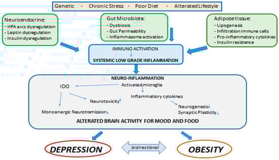 Even in obesity, various evidences from the literature report that low-grade chronic inflammation is associated with it. This is characterized by an increase in circulating proinflammatory cytokines and accumulation of immune cells in different tissues and organs, including the central nervous system (CNS). During chronic stress there is evidence that these cytokines promote depression-like behavior by disrupting the synthesis of neurotransmitters and signal transduction. Animal models of obesity and depression revealed a two-way relationship whereby high-fat nutrition and chronic stress synergize and aggravate metabolic dysregulation and behavioral abnormalities. Although not yet exhaustive, several evidences from the literature suggest that inflammation in the central and peripheral nervous system can link obesity to major depressive disorder [35].