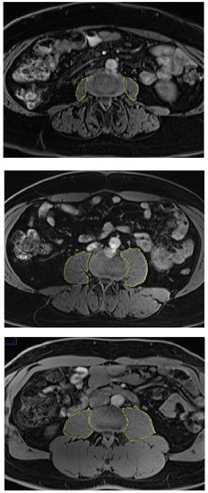 Abdominal MR scans were performed in all participants using 3.0 Tesla MAGNETOM Skyra® MR scanner (Siemens, Erlangen, Germany). Details of the protocol were described elsewhere [21]. PMV was calculated in cm3 by measuring the cross-sectional area of the left and right psoas major muscle from the second lumbar vertebral level to the fifth lumbar vertebral level and multiplying it by the thickness of MR slices (0.3 cm), as described in detail elsewhere [22]. Representative measurements of PMV are displayed in Figure 1. SMFD was determined from the cross-sectional area (in pixels) of the left and right paraspinous muscles (i.e., iliocostalis, longissimus, and multifidus) at the lower endplate of the third lumbar vertebra (total paraspinous area), as described in detail elsewhere [23]. Representative measurements of SMFD are displayed in Figure 2.