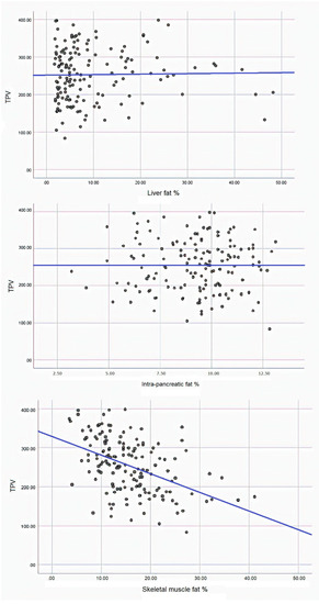 Relationship between psoas muscle volume and liver fat deposition (upper panel), intra-pancreatic fat deposition (middle panel), and skeletal muscle fat deposition (lower panel).