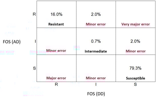 To evaluate the harmony between both methods, we applied the Cohen’s kappa index to correlate the MIC values and inhibition zones interpreted by CLSI breakpoints. Our results revealed an exceptional agreement between both techniques (κ = 0.88) following the Landis and Koch classification scale (Table 2). Additionally, we obtained a categorical agreement of 96%, leaving 4% inconsistencies between methodologies, which were categorized as minor Errors (mEs). It is important to note that the discrepancies we identified corresponded when one of the methods revealed intermediate susceptibility while the other concluded susceptible or resistant. No false sensitive (VME) or false resistant (ME) error results were found (Figure 1). Overall, our results demonstrate that disk diffusion can be used as a reliable method to quickly assess fosfomycin resistance in clinical diagnostic laboratories.