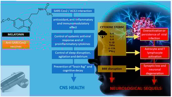 - Romero, A.; Ramos, E.; López-Muñoz, F.; Gil-Martín, E.; Escames, G.; Reiter, R.J. Coronavirus Disease 2019 (COVID-19) and Its Neuroinvasive Capacity: Is It Time for Melatonin? Cell. Mol. Neurobiol. 2020. [Google Scholar] [CrossRef] [PubMed]