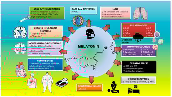 Such a possibility has been the subject of analysis in the literature [,]. As an extension to that view, we hereby discuss evidence implying that melatonin (a) prevents SARS-of CoV-2 infection; (b) is suitable as an effective anti-inflammatory/immunoregulatory/antioxidant agent; (c) counteracts chronodisruption; (d) combats several comorbidities such as diabetes, metabolic syndrome, and ischemic and non-ischemic cardiovascular diseases, which aggravate COVID-19 disease; (e) exerts a neuroprotective effect in acutely and chronically affected SARS-CoV-2 patients; and (f) can be an adjuvant to potentiate anti-SARS-CoV-2 vaccines. This multifactorial therapeutic potential is unique to melatonin and is not shared by any other therapeutic drug candidate for the COVID 19 pandemic. The medical literature was identified by searching databases including MEDLINE and EMBASE, bibliographies from published literature, and clinical trial registries/databases. Searches were last updated on November 23, 2020.