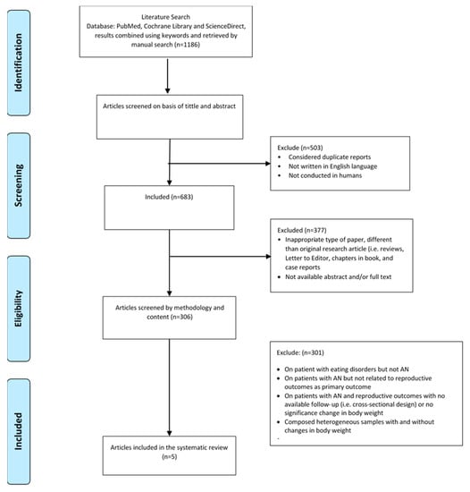 The initial search across the three databases retrieved 1186 papers. After the first round of screening (titles and abstracts), 503 papers were excluded on the following grounds: not in English, not conducted on humans, or were considered as duplicates. The second round of screening excluded: inappropriate types of papers that were different from the original research article (i.e., review articles, clinical case reports, chapters from books, and ‘Letters to the Editor’) or were not available abstract and/or full text (n = 377). Of the remaining 306 articles screened according to methodology and content, 301 papers were excluded on the following grounds: (i) dealing with eating disorders, but not AN, (ii) about patients with AN, but not related to reproductive health outcomes, (iii) conducted on patients with AN on reproductive health outcomes, but with a cross-sectional design or with unavailable follow-up data, (iv) composed of non-homogenous samples, in other words, recovered and weight-restored patients with AN as well as patients who were still actively affected by AN.