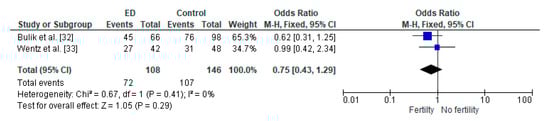 Figure 2 shows the effect sizes and 95% CI of the two studies included in the meta-analysis. The pooled odds ratio of childbirth rates between the two groups (AN group vs. the general population) was not statistically significant (OR = 0.75, 95% CI: 0.43–1.29, p = 0.41), and a heterogeneity analysis revealed I2 = 0%.