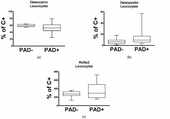 Regarding the leucocytic OPN and RUNX2 transcripts, this was significantly elevated in PAD+ patients compared to the PAD− group (Figure 1b,c). The median percentage mRNA level for OPN in PAD+ was 9.5% and for PAD− 6.5% (p = 0.0241), and for RUNX2 was 292.5% and for PAD− 274.5% (p = 0.0449).