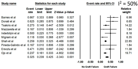 Overall, the pooled estimated rates of all-cause graft failure, graft failure before death, and allograft rejection were 32.5% (95%CI: 23.9%–42.5%, I2 = 50%), 14.5% (95%CI: 8.4%–23.7%), and 20.2% (95%CI: 15.4%–25.9%), respectively (Figure 2). From a sensitivity analysis limited only to the recent studies (year 2001 or newer when ERT became available) (Table 1), the pooled estimated rates of all-cause graft failure, graft failure before death, and allograft rejection were 28.1% (95%CI: 20.5%–37.3%), 11.7% (95%CI: 8.4%–16.0%), and 20.2% (95%CI: 15.5%–26.0%), respectively.