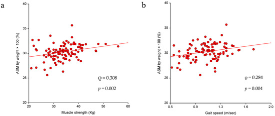 (a) Association between low SMM and handgrip strength (kg) and also (b) gait speed (m/s) in the study sample (n = 102).
