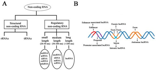 Schematic diagram to illustrate the diversity of long noncoding RNAs (lncRNAs) in the mammalian genome. (A) Classification of noncoding RNAs according to their size and function. (B) Overview of the biogenesis of various lncRNAs through different mechanisms. Different colors indicate different regions of DNA elements in the mammalian genome.