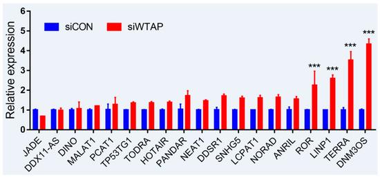 As is well-known, DNA damage is closely involved with the occurrence and development of cancers, and many lncRNAs were involved in the repair of DNA damage [94,95]. To further examine whether the expression of lncRNAs is regulated by m6A, an analysis of RT-qPCR was performed to detect the expressions of some lncRNAs related to DNA damage. For the purpose, some lncRNAs from siControl- and siWTAP-transfected HCC cell lines (SMCC7721) were selected for the analysis. The results showed that the expressions of ROR, LINP1, TERRA, and DNM3OS were significantly increased by over two-fold compared with the control group (Figure 2, unpublished data). Additionally, the expressions of DDSR1, SNHG5, LCPAT1, NORAD, and ANRIL also showed a 1.5-fold increase compared with the control group, and the statistical analysis further showed that there were significant differences between siControl and siWTAP (Figure 2). As far as the rest of the lncRNAs (Figure 2) were concerned, no obvious changes in the expression levels were observed compared with the control group. Therefore, we think that the expressions of some lncRNAs related to DNA damage could be regulated by m6A, indicating that the modification may play an important role in the regulation of the DNA damage response. However, abnormal regulation may directly promote tumorigenesis.