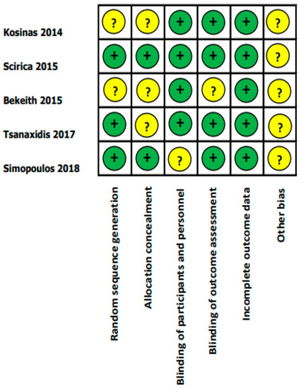 Two blinded reviewers (P.L., R.C.) assessed the risk of bias by the Cochrane Collaboration’s tool for assessing the risk of bias in randomized trials. The following risks of bias were evaluated: random sequence generation, allocation concealment, blinding of participants and personnel, blinding of outcome assessment, incomplete outcome data, and other bias.