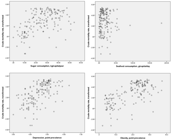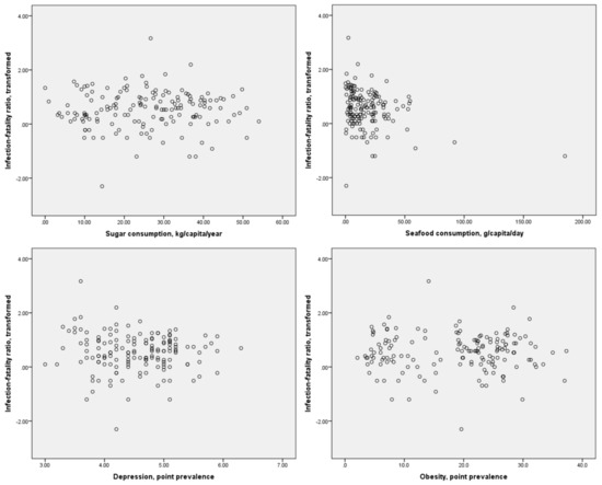 | Variable | COVID-19 Crude Mortality Rate | COVID-19 Case Fatality Ratio | Sugar Consumption, kg/Capita/Year | Seafood Consumption, g/Capita/Day | Depression, Point Prevalence (%) | Obesity, Point Prevalence (%) |