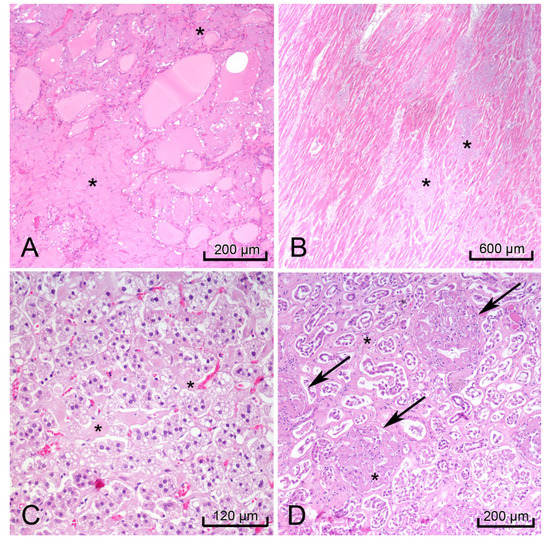 Images of hematoxylin & eosin (H&E) stained organs with hyaline extracellular matrix (black *) that indicated amyloidosis. Thyroid (A), heart, left ventricle (B), right adrenal gland (C), and right kidney (black arrows glomeruli) (D).