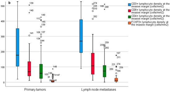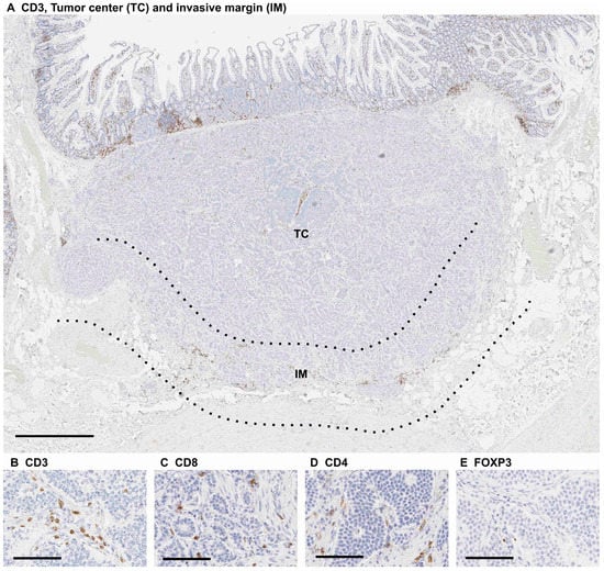 CD3+, CD8+, CD4+ and FOXP3+ immunohistochemistry was analyzed by J.P.V. using a previously validated cell counting method and QuPath v. 0.1.2 software (created at the Centre for Cancer Research & Cell Biology, Queen’s University Belfast, developed at the University of Edinburgh, Edinburgh, UK) [17,18]. Immune cell densities were measured at the tumor center and at the invasive margin. The invasive margin was defined as a region extending 0.5 mm from both sides of the tumor border (Figure 2).