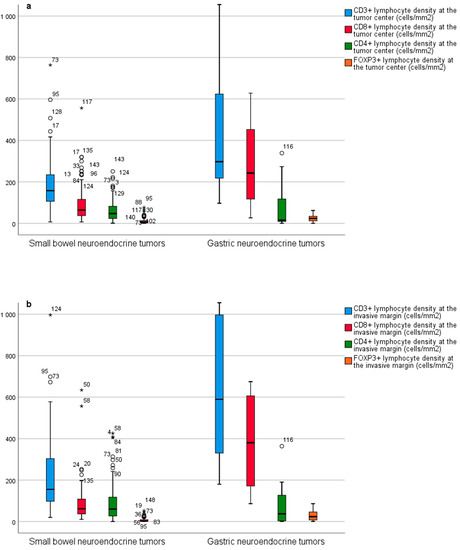 Some studies evaluating pNETs have provided opposing results compared with our findings. Katz et al. examined immune cell infiltrations in 87 pNETs and found that CD3+ T cell infiltration was associated with improved recurrence-free survival [23]. Wei et al. calculated the Immunoscore in 158 pNETs and proposed the Immunoscore system for pNETs (ISpnet) as a predictive tool to assess prognosis [11]. In their study, low peritumoral CD4+ cell infiltration, high intratumoral CD8+ cell infiltration and low peritumoral CD8+ cell infiltration were significantly associated with recurrence-free survival. Katz et al. investigated 39 NET liver metastases [23]. They evaluated lymphocyte densities by manual cell counting per 10 high power fields and scored the samples from 0 to 3 based on predetermined increments. Cut-off points for analyses (low vs. high cell densities) were assigned based on median score. They found that a low level of FOXP3+ lymphocytes in NET liver metastases was a predictor for prolonged overall survival [23]. De Reuver et al. found increasing FOXP3+ T cell densities to be associated with worse disease-specific survival in a cohort of 101 pNETs [24]. For analyses, they categorized the cases in grades from 0 (no lymphocytes) to 2 (five or more lymphocytes) based on the amount of positively stained FOXP3+ T cells in a one-millimeter diameter core.