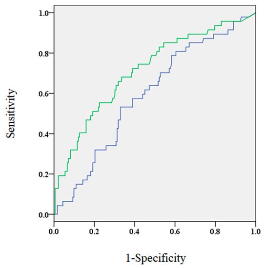 The area under the curve for brain natriuretic peptide (BNP) levels 3 months after the procedure (green) and before the procedure (blue) were 0.714 and 0.593, respectively.