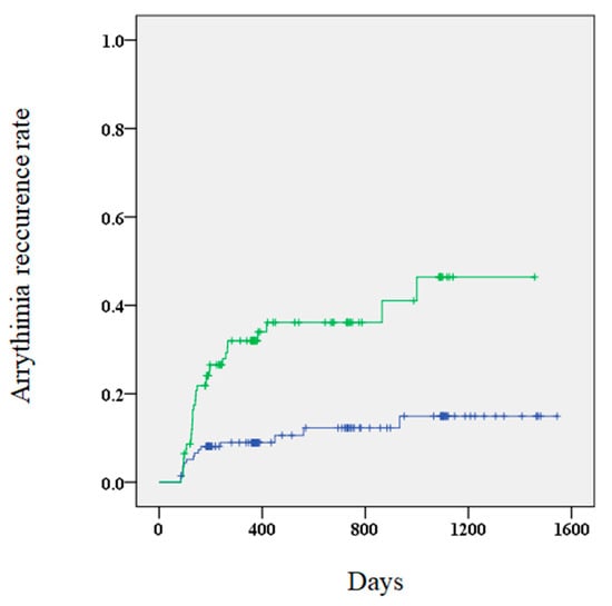 A Kaplan–Meier curve showing the arrhythmia recurrence rate for patients with (green) and without (blue) elevated BNP (brain natriuretic peptide) levels.