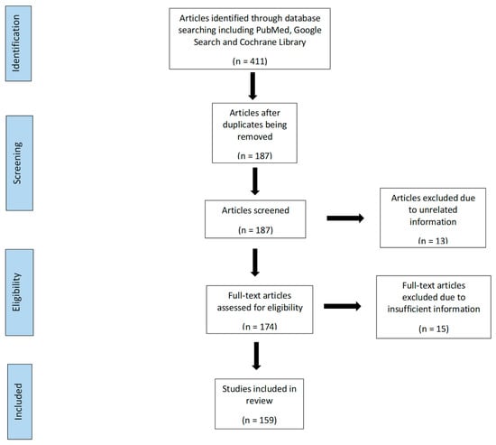 There were 411 articles identified through database including PubMed, Google Search and Cochrane Library. We exclude 224 because of duplication and 187 articles reviewed for inclusion. There were 174 full-text articles assessed for eligibility with subsequent 159 of these included in this review (Figure 1).