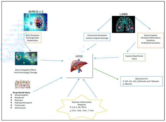 There are a number of studies that have investigated the relationship between liver dysfunction and causative factors such as cytokine storm with the involvement of pro-inflammatory biomarkers in COVID-19. In a group of 150 hospitalized COVID-19 patients, 45.6% of the patients presented with elevated ALT levels that were associated with high AST/ALT ratio as well as raised GGT and ALP levels. The mild hepatitis observed in these patients may be due to immune-mediated hepatic injury caused by the inflammatory response subsequent to the SARS-CoV-2 infection [113]. Moreover, Kudaravalli et al. reported findings from a case series involving COVID-19 patients with a mortality rate of approximately 3.7%. The liver dysfunction in these patients could be explained by a number of factors including significant injury from cytokine storm, hypoxia-induced impairment, hepatitis due to SARS-CoV-2 infection and medication-induced hepatic injury [114].