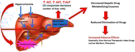 Liver dysfunction can result directly through elevated uric acid level through multi-dimensional mechanisms. It can induce inflammation and oxidative stress, leading to liver cell death and decrease in functional hepatocytes through lipids and glucose metabolism []. Interestingly, uric acid has the potential to cause oxidative stress and mitochondrial dysfunction directly []. Uric can also increase lipid synthesis by stimulating endoplasmic reticulum (ER) stress and though Sterol regulatory element-binding protein 1 (SREBP-1) and other transcriptional elements []. Increased lipid levels in turn can cause inflammation and oxidative stress. In addition, uric acid can promote cellular glucose biosynthesis which can catalyze increased inflammation in liver []. Thus, uric acid either directly or via lipids and glucose can induce inflammation and oxidative stress, leading to liver cell death and decrease in functional hepatocytes (Figure 1). These events reduce the liver’s functional capacity resulting in elevated levels of liver enzyme functions (ALT, AST, ALP). As a secondary outcome of compromised liver function, the liver drug metabolizing capacity and ability to eliminate drugs can decrease. This can reflect in increased drug adverse effects and potential treatment failure []. It is worth recognizing that hyperuricemia is the driving force behind development of gout, a severe inflammatory condition []. Indeed, levels of several inflammatory markers including white blood cell, neutrophil count, C-reactive protein, interleukin-6, interleukin-18 and tumor necrosis factor-α were higher in hypouricemic conditions []. The cellular and tissue alterations of liver are considered directly responsible for histopathogenesis of NAFLD including steatosis and non-alcoholic steatohepatitis [,]. In addition, recent reports suggest that hyperuricemia is a potential marker for cardio-metabolic disease including arrythmia [,]. Thus, the mechanism of uric acid-driven liver dysfunction can be complex and multifaceted and appears to occur through inflammation-related pathways. The results from the current study suggest that elevated serum uric acid levels are associated with abnormal liver function.