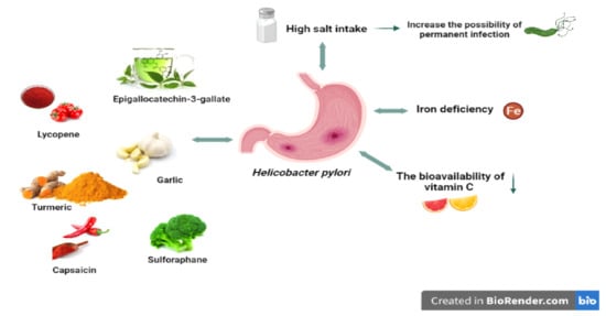 Lycopene, a natural antioxidant, is a carotenoid that gives fruits and vegetables their red colour [147]. Some studies revealed that lycopene inhibits DNA damage and the cellular response of H. pylori-infected gastric carcinoma cells (AGS) [148,149]. In a study by Shidfar et al., it was shown that the effect of lycopene was not significant in the treatment of H. pylori-positive patients [150]. The main findings of some dietary interventions in H. pylori are summarised in Table 1.