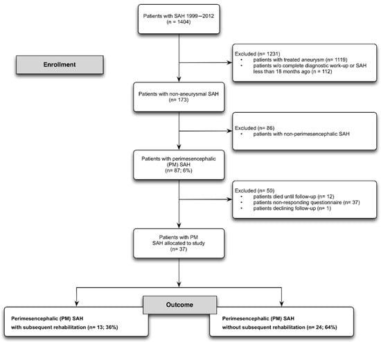 In total, 87 patients met the criteria for PM SAH. Until long-term follow-up, 12 patients died (14%), 37 patients declined the follow-up and 1 patient could not be informed. Therefore, 37 patients were included for further analysis. Questionnaires were answered after 77 months post-SAH in median (range 33–159 month). Median age of patients at ictus of PM SAH was 55.1 years (±11.5). From 37 patients, 13 patients (35%) received subsequent rehabilitation and 24 (65%) did not.