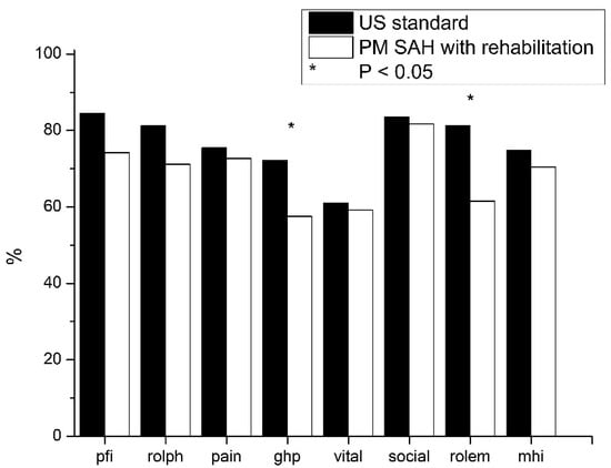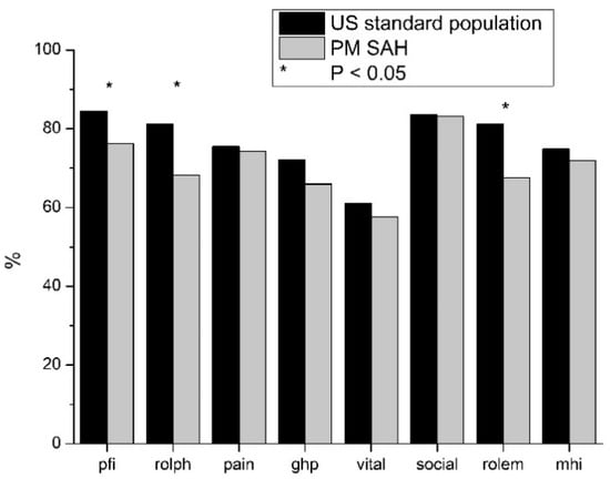 When PM SAH Was compared to the standard population, a reduction in quality of life in every field of SF-36 was identified. In social functioning, HRQoL nearly reaches the standard population. Differences in physical pain, general health problems, vitality and general mental health were lower. Higher deviations in the reduction in HRQoL were shown in physical functioning, role limitations due to physical health problems and role limitations due to emotional problems. The only statistically significant reductions in HRQoL were revealed in general health problems, role limitations due to emotional problems and role limitations due to emotional problems (p < 0.05; Figure 2).