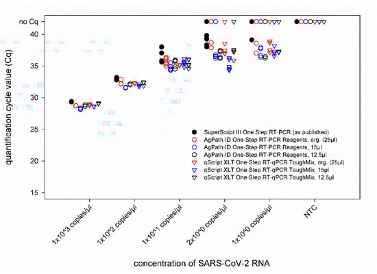 A dilution series of the RNA standard was tested by the IP4 real-time RT-PCR combined with different volumes of the AgPath-ID One-Step RT-PCR Reagents and qScript XLT One-Step RT-qPCR ToughMix kits in comparison to the published protocol []. From 103 to 101 copies/µL, every replicate of each approach tested positive, and comparable quantification cycle (Cq) values were obtained (Figure 1). The LOD95% was below 10 for every approach (Supplementary Table S1). For SARS-CoV-2 dilutions containing 2 × 100 or 1 × 100 copies/µL, some of the replicates scored negative. However, an influence of a specific PCR kit or total reaction volume could not be observed, as none of the approaches failed to detect every replicate of a given RNA concentration, and even these very low concentrations could be detected by RT-PCR set-ups using reduced volumes (Figure 1). Hence, all the following analyses were carried out using a total reaction volume of 12.5 µL.