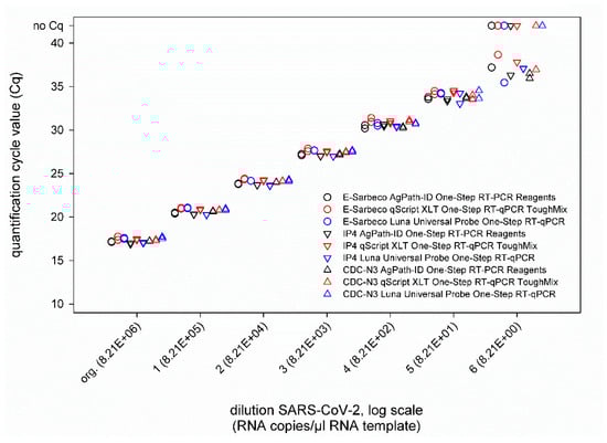 Next, a ten-fold dilution series of culture-grown virus was tested. This virus preparation contained 8.21 × 106 RNA copies per µL RNA template, as was determined based on an external standard. When comparing the three different SARS-CoV-2 real-time RT-PCRs, i.e., IP4, E-Sarbeco, and CDC-N3, run in combination with either the AgPath-ID One-Step RT-PCR Reagents kit, the qScript XLT One-Step RT-qPCR ToughMix kit, or the Luna® Universal Probe One-Step RT-qPCR kit, nearly identical Cq values were obtained in every approach (Figure 2). Only in the highest virus dilution was a certain degree of variability observed, but without a prominent effect of a given real-time PCR chemistry, since in every combination, at least one of the duplicates tested weakly positive (Figure 2).