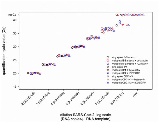 In addition, the combination of the SARS-CoV-2 real-time RT-PCRs with IC systems did not negatively influence the PCR performance (Figure 2), as nearly identical Cq values were measured for SARS-CoV-2 dilutions (second virus preparation) ranging from 10−2 to 10−7 (corresponding to 9.21 × 105 to 9.21 × 100 RNA copies per µL RNA template) in singleplex and duplex approaches, independent of the applied IC assay (Figure 3). The LOD95% of every approach is given in Supplementary Table S2.