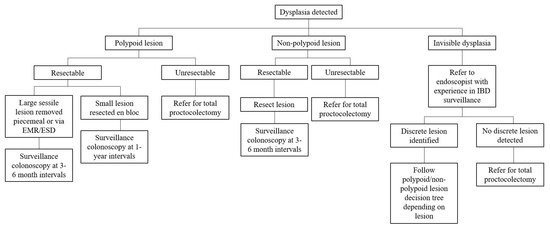 As per the current ASGE guideline, SCENIC international consensus statement, ECCO consensus statement, ACG guideline, and AGA clinical practice update on dysplasia in UC, dysplasia detected on biopsy with a discrete lesion should be resected endoscopically if possible. If complete endoscopic resection is achieved, the patient should be followed with surveillance colonoscopies at shortened intervals (i.e., 1 month, 6 months, and 1 year) with biopsies obtained from the base of the resection site. In these patients, total proctocolectomy may not be necessary. However, patients with invisible dysplasia (e.g., dysplasia detected on random biopsies or not from a discrete lesion) should be referred for repeat HD-WLE endoscopy with surface CE by an endoscopist experienced in IBD surveillance [10].