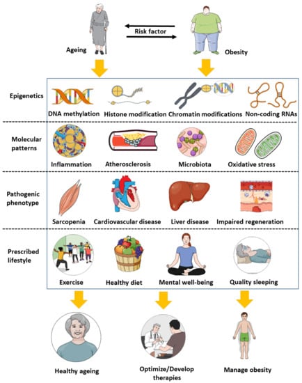 Ghanemi, A.; Yoshioka, M.; St-Amand, J. Ageing and Obesity Shared Patterns: From Molecular Pathogenesis to Epigenetics. Diseases 2021, 9, 87. https://doi.org/10.3390/diseases9040087