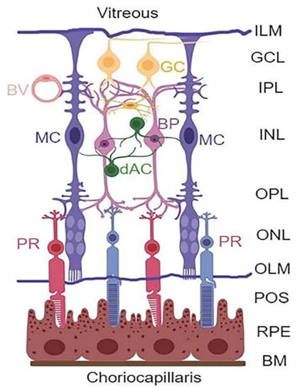 Retinal layers and cell types. The retina is structured in three main neuronal layers: ganglion cell layer (GCL), bipolar neuron layer (BP, INL), and photoreceptor layer (PR, ONL). Between these neuronal layers, axonal-synaptic connections are formed as the inner plexiform layer (IPL) between bipolar and ganglion cells, while the outer plexiform layer (OPL) is the connection between photoreceptors and bipolar neurons. Other retinal neuronal cells include amacrine dopamine (dAC) and horizonal cells. The retina also has macroglia (astrocytes and Müller glial cells) and microglia (immune cells). The astrocytes are found at the GCL or nerve fiber layer on the vitreous side, while MC occupy the entire length of the neuroretina forming inner limiting membrane (ILM) at the vitreous, and the outer limiting membrane (OLM) at the photoreceptor outer segment (POS). Müller cells play critical roles in the formation of neurovascular unit and retinal homeostasis. (Created with BioRender.com, accessed on 9 December 2021).