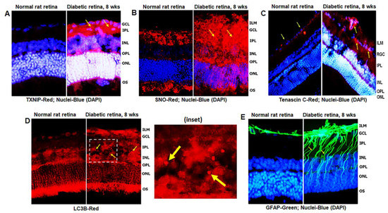 Diabetes induces TXNIP expression and redox stress in the retina, as demonstrated by enhanced staining of TXNIP and protein s-nitrosylation (SNO) when compared to non-diabetic control retinas (Figure 2A,B), indicating that TXNIP upregulation and an inhibition of the Trx/TrxR redox system may be involved in this process. In addition, enhanced expression of extracellular matrix protein Tenascin-C was observed at the blood vessel basement membrane and GCL/ILM (Figure 2C). Tenascin-C is associated with tissue injury and repair, and involved in angiogenesis and innate immune responses (via TLR4 binding) under cell stress. Furthermore, autophagosomes, LC3B punctate formation, are seen in the diabetic rat retina more than in the normal rat retina (Figure 2D). MCs react to retinal injuries in an effort to prevent further retinal damage, which is known as Müller cell reactivity or gliosis, and manifested in diabetic retinas by an induction of radial GFAP in the neuroretina (Figure 2E).