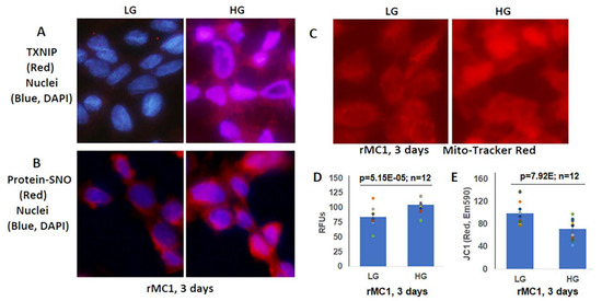 High glucose induces TXNIP expression and redox stress in rMC1 in in vitro culture. (A) HG exposure of rMC1 cells for 3 days increases TXNIP expression and (B) protein s-nitrosylation (SNO), suggesting cellular oxidative/nitrosative stress when compared to LG. DAPI was used to counter stain the nuclei (blue). (C,D) Similarly, mito-tracker red staining (EX579/Em599) and mitoSox fluorescence intensity (EX510/Em580) are also enhanced, indicating mitochondrial stress and damage. (E) In agreement, mitochondrial membrane potential is disturbed/depolarized (reduced red of JC-1 aggregates, EX535/Em590) in rMC1 under HG versus LG. The immunofluorescence images represent n = 3, captured by an Olympus BX51 fluorescence microscope at 400× magnification.