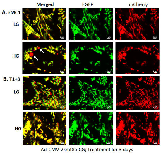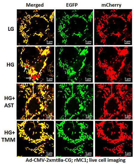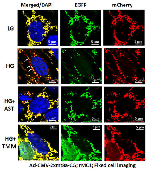 For these experiments, we used Ad-CMV-2×mt8a-CG both in live and fixed-cell confocal imaging. In live-cell imaging under LG, as mentioned before, mitochondria are seen as yellow, a combination of mCherry and EGFP, while lysosomes are seen as red spots, mCherry alone (Figure 7, first panel). However, under HG, some of the yellow mitochondria are seen as fragmented and enlarged red mitolysosomes, indicating a mitophagic flux (Figure 7, second panel). Furthermore, we used another three drugs in combination that we have previously shown effective in reducing auronofin-mediated redox stress and mitophagic flux in retinal pigment epithelial cells [20], shown in Figure S7. These drugs include amlexanox (4 μM), which is an TBK1 kinase inhibitor that phosphorylates optineurin and p62 adaptors to increase their activity, SS-31 (4 μM, a mitochondria-targeted anitoxidant), and Tranilast (56.6 μM, an inhibitor of NLRP3), denoted as AST, and they together also inhibit TXNIP expression (Figure S7, inset). We compared this triple drug combination of AST with the current triple combination of TMM. We observed that both AST and TMM reduce mitophagic flux in rMC1 in HG, as revealed by fewer and reduced sizes of the red mCherry lysosomes (Figure 7, lower two panels), which is more or less similar to that observed in LG. However, TMM appears to maintain more filamentous mitochondria than AST treatment. A similar observation is also observed with fixed-cell confocal imaging of Ad-CMV-2×mt8a-CG transduced rMC1 (Figure 8), indicating that 2×mt8a-CG probe can be used both in live- and fixed-cell imaging.