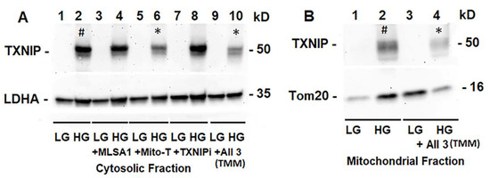 HG induces TXNIP expression and triple drug combination treatment reduces TXNIP in rMC1. (A) On Western blots, TXNIP expression increases ~4.62 +/− 0.34 folds by HG (lane 2 #, mean +/− SE versus LG, n = 3). Lysosome-targeted drug ML-SA1 (20 μM) or TXNIP-IN1 (TXNIPi, an inhibitor of TXNIP-Trx interaction, 5 μM) has no effect on HG-induced TXNIP expression, while mitochondria-targeted anti-oxidant mito-Tempo (5 μM) and triple drug combination, TMM, reduces TXNIP level by 69% (lane 6 *) and 50% (lane 10 *), respectively, versus HG (2), n = 3). (B) Similarly, TXNIP level also increases in the mitochondrion under HG (lane 2 #, ~2.3-folds versus LG, n = 3), while combination drug (TMM) treatment reduces ~70% (Lane 2 versus Lane 4 *, n = 3).