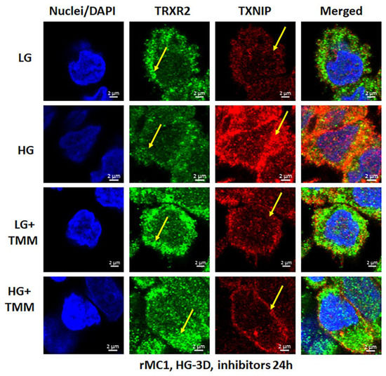 HG reduces mitochondrial thioredoxin reductase 2 (TRXR2) in rMC1. HG exposure of rMC1 for 3 days reduces TRXR2 level compared to LG, while that of TXNIP is increased (first two panels). On the other hand, treatment of rMC1 with triple drug combination TMM increases TRXR2 and decreases TXNIP level under both HG and LG, suggesting a beneficial effect of these drugs on HG-induced redox stress. A representative of n = 3 is shown from fixed-cell confocal imaging at 630× magnification in a Zeiss confocal microscope.