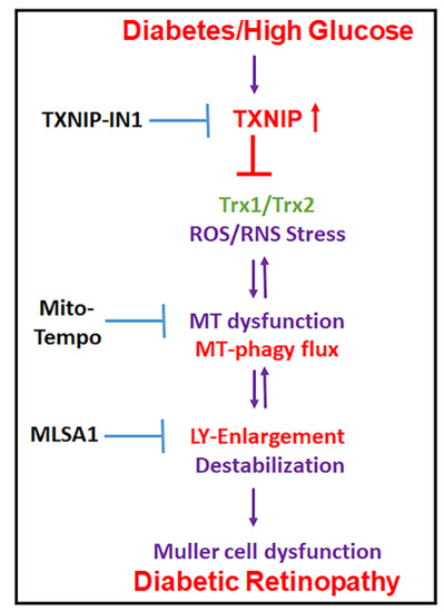 The following are available online at https://www.mdpi.com/article/10.3390/diseases9040091/s1, Figure S1: TXNIP knockdown prevents LC3B punctate and redox stress in the diabetic rat retina, Figure S2: TXNIP knockdown prevents Müller glial activation in the diabetic rat retina, Figure S3: Diagram of the adenovirus-CMV-2×mt8a-mCherry-EGFP mitophagic probe (vector builders), Figure S4: Mitochondria and lysosome targeted drugs prevent mitophagic flux in rMC1, Figure S5: Diagram showing drug targeting the TXNIP-redox and the mitochondrial–lysosomal pathway, Figure S6: TXNIP-IN1 does not reduce HG-induced TXNIP expression in rMC1, Figure S7: A potential combination drug therapy for redox stress-induced mitochondrial–lysosomal axis dysregulation and inflammasome activation in retinal diseases, Figure S8: HG increases TXNIP expression and reduces transcription factors TFEB and PGC1α in rMC1.