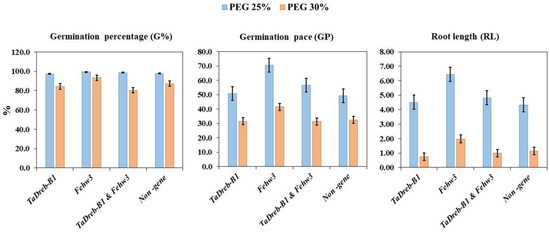 To investigate of the two genes efficacy in improving drought tolerance, all genotypes were divided into the following four groups, namely, non-gene, TaDreb-B1, Fehw3, and Fehw3 and TaDreb-B1. Then, each trait’s average was scored and compared under two drought stress conditions among the four groups (Supplementary Tables S5 and S6 and Figure 5). Under PEG25%, the genotypes with Fehw3 had a better performance than the average of the genotypes in the other three groups in all traits except dry biomass weight (DBW). However, under PEG30%, the Fehw3 group had a better performance than the genotypes’ average performance in the other three groups in all traits except SRR and DBW (Figure 5). A high Fehw3 effect on GP, RL, NR, and SL under PEG25% was observed. On the other hand, it was observed that there were differences between the Fehw3 group and the other groups in G%, GP, RL, and NR under PEG30%. (Supplementary Tables S5 and S6).