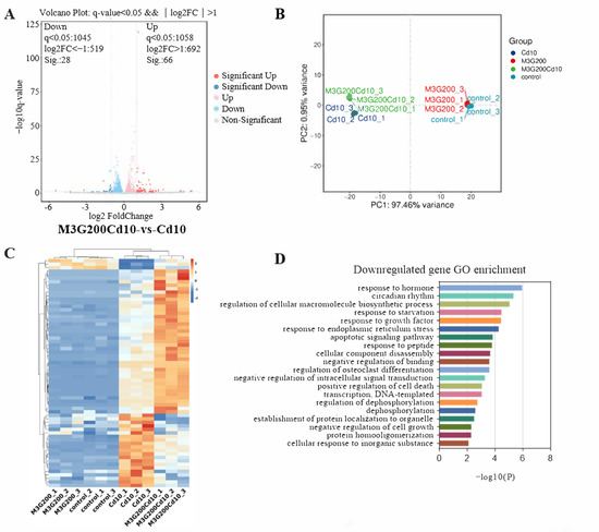 Cells were seeded at 4 × 105 per well in 6-well plates for 12 h; then, they were treated with 10 µmol/L CdCl2 and 200 µmol/L M3G separately or in combination for 24 h. After treatment, total RNA was extracted by the Trizol reagent (Beyotime Biotech, Shanghai, China) according to the manufacturer’s protocol. Then, RNA purity and integrity were assessed using the NanoDrop 2000 spectrophotometer (Thermo Scientific, Waltham, MA, USA) and the Agilent 2100 Bioanalyzer (Agilent Technologies, Santa Clara, CA, USA). Following the construction of the libraries with the TruSeq Stranded mRNA LT Sample Prep Kit (Illumina, San Diego, CA, USA), the library was sequenced on the Illumina HiSeq X Ten platform to generate a 150 bp paired-end read. Using Trimmomatic, raw reads in fastq format were processed to remove low-quality reads and obtain clean reads. Clean reads were mapped to the human genome (GRCh38) with HISAT2.
