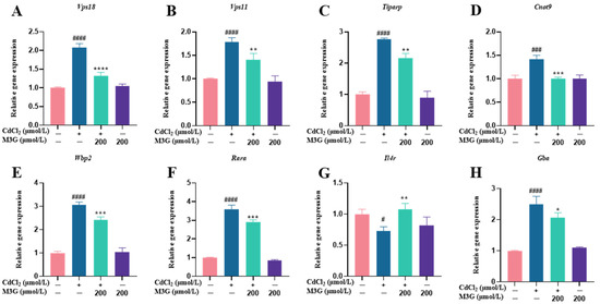 There was no significant change in cell viability following a 24 h exposure to MV, M3G, or M3,5G (Figure 1C–E). Furthermore, it was discovered that MV treatment at any concentration did not lessen CdCl2-induced cytotoxicity (Figure 1F). However, M3G at 100 and 200 µmol/L, and M3,5G at 50 µmol/L, showed significant protective effects, with cell viability values increased to 94.2%, 97.7%, and 88.8%, respectively (Figure 1G,H). Consequently, 50, 100, and 200 µmol/L M3G were considered for the remaining measurements due to the best protective effects.