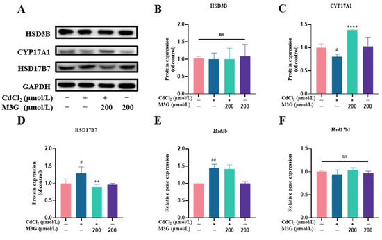M3G ameliorated the abnormal expression of CYP17A1 and HSD17B7 caused by CdCl2 exposure to KGN cells. Protein and gene expression of KGN cells after treatment with 10 µmol/L CdCl2 and 200 µmol/L M3G alone or in combination: (A) protein expression of HSD3B, CYP17A1, and HSD17B7; quantification of band intensity of (B) HSD3B, (C) CYP17A1, and (D) HSD17B7 normalized to GAPDH; gene expression of (E) Hsd3b, (F) Hsd17b1, (G) Hsd17b7, (H) Hsd17b12, and (I) Gper1. Mean ± SD, n = 3. # p < 0.05, ## p < 0.01, ### p < 0.001, #### p < 0.0001, vs. control; * p < 0.05, ** p < 0.01, **** p <0.0001, vs. CdCl2-treated group. ns, no significant.
