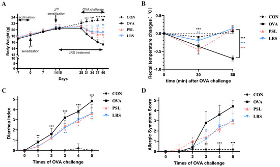(A) Body weight of mice measured over the indicated time course. (B) The decrease in rectal temperature induced by ovalbumin (OVA) challenge. (C) Diarrhea index of mice following oral OVA challenge. (D) Allergic symptom score of mice following oral OVA challenge. CON: control group without ovalbumin sensitization and challenge; OVA: allergic model group with ovalbumin sensitization and challenge; PSL: allergic model mice with prednisolone treatment; LRS: allergic model mice with lotus-seed resistant starch treatment. * p < 0.05, ** p < 0.01, *** p < 0.001 compared to OVA group.