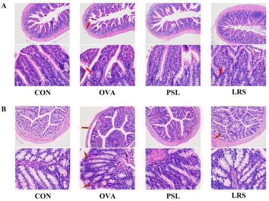 (A) Hematoxylin-eosin staining of jejunum tissue slides (×100, upper panel) and (×400, lower panel). (B) HE staining of the colon in different groups (×100, upper panel) and (×400, lower panel). CON: control group without ovalbumin sensitization and challenge; OVA: allergic model group with ovalbumin sensitization and challenge; PSL: allergic model mice with prednisolone treatment; LRS: allergic model mice with lotus-seed resistant starch treatment. Arrow marks indicate the severe villi shedding, deepening of crypt depth, and intestinal tissue shedding.
