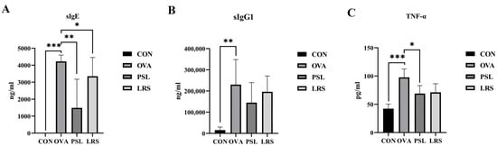 (A) The serum levels of OVA-specific IgE. (B) The serum levels of OVA-specific IgG1. (C) The serum levels of TNF-α. CON: control group without ovalbumin sensitization and challenge; OVA: allergic model group with ovalbumin sensitization and challenge; PSL: allergic model mice with prednisolone treatment; LRS: allergic model mice with lotus-seed resistant starch treatment. * p < 0.05, ** p < 0.01, *** p < 0.001 compared to OVA group.