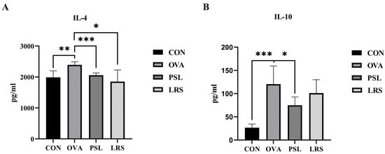 (A) The serum levels of IL-4. (B) The serum levels of IL-10. CON: control group without ovalbumin sensitization and challenge; OVA: allergic model group with ovalbumin sensitization and challenge; PSL: allergic model mice with prednisolone treatment; LRS: allergic model mice with lotus-seed resistant starch treatment. * p < 0.05, ** p < 0.01, *** p < 0.001 compared to OVA group.